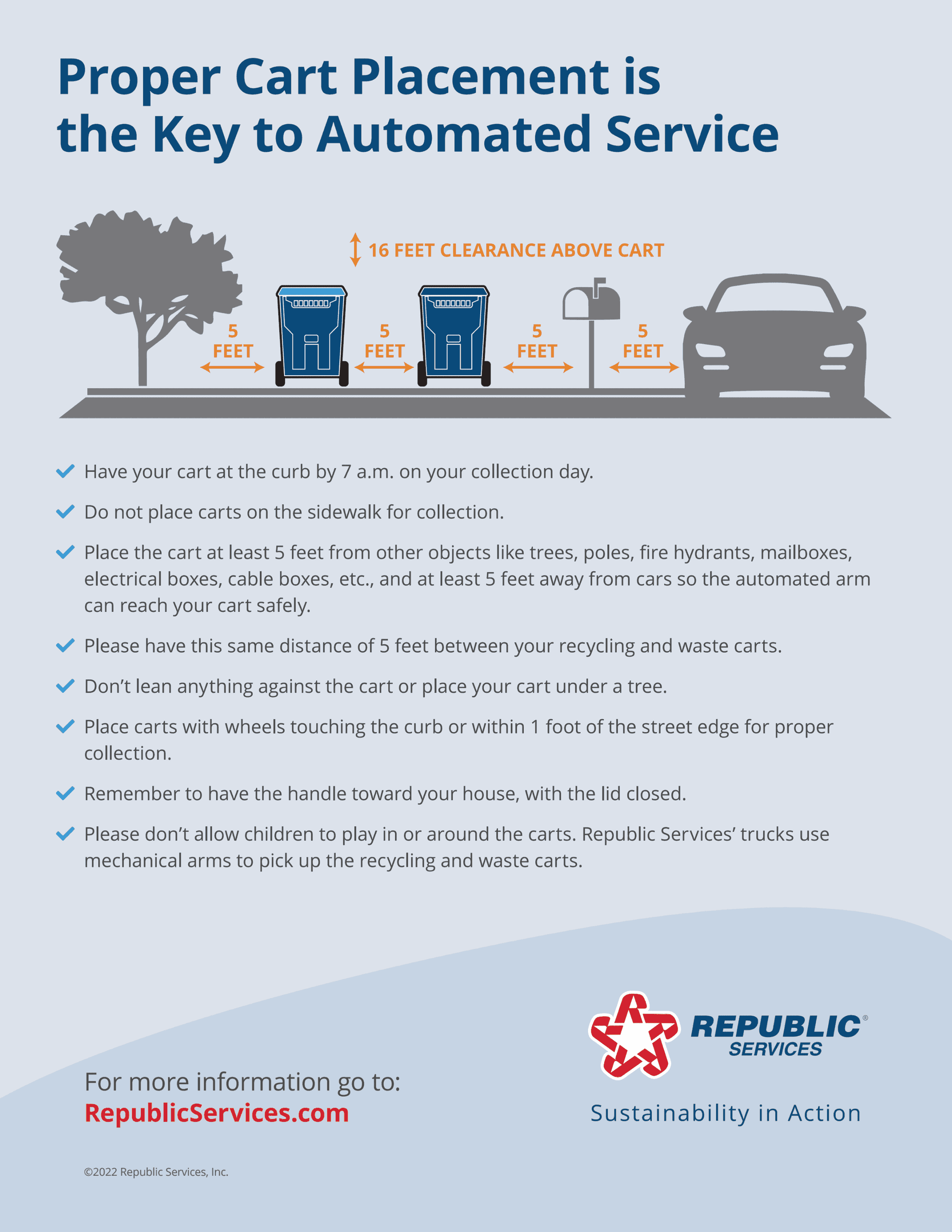 - Keep carts at least 5 feet away from mailboxes, parked cars, trees, and other objects to ensure safe collection.